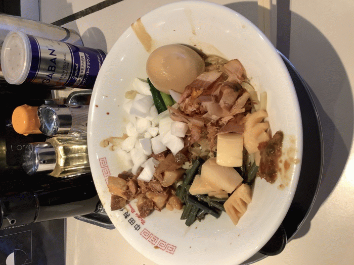 中田製作所、【5月水曜日限定】季節の山菜と野菜まぜそばブラック〜筍の炊き込み追い飯付〜1100円+味玉110円。5月第2週目の限定は、季節の山菜と野菜を使用したまぜそばブラックです。季節のわらびとたけのこと白子玉ねぎが具材に使用されて、追い飯は筍の炊き込みご飯です。わらびと玉ねぎがまぜそばに意外と合います。残ったタレが多めなので、追い飯をドボンというよりは、具材を追い飯にオンザライスにして締めます。