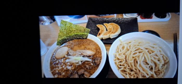 濃厚な豚骨ベースのつけダレに、極太麺のモチモチ、プリプリの食べ応えの有る麺に、今回は、煮卵1個とと、半餃子3個と、チヤーシュー増量しました。