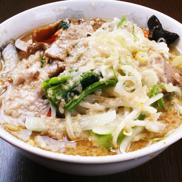 コッテリ濃厚な味噌ベースのスープを太麺で!!もやしやキャベツ、タマネギ、キクラゲなどたっぷりの炒め野菜を乗せ、ふりかけた背脂でコク感アップ♪