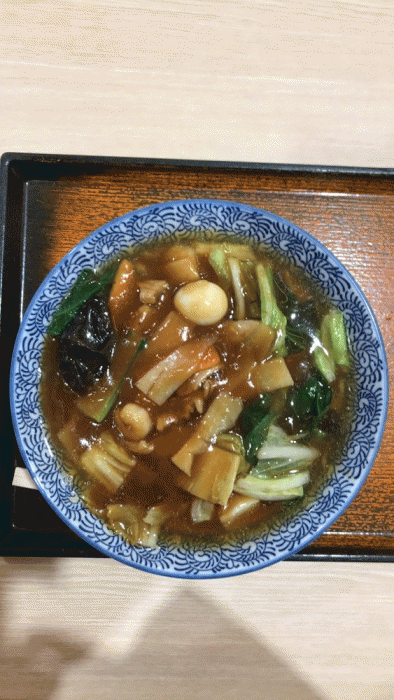 動物系と魚介系の醤油スープに、たっぷり野菜の熱々とろみ餡が最高ですよ。