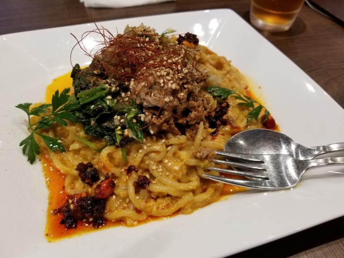 汁なしは熱々なうちに豪快に混ぜて食べるイメージでしたが、こちらはスプーンとフォークでパスタ風に上品に食べるスタイル。個人的にはもう少し温かい温度で食べたい。