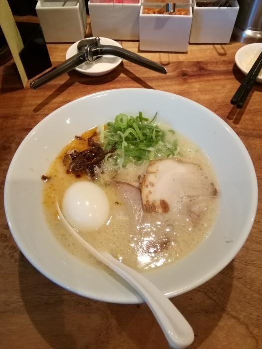 博多一風堂で白丸元味(味玉クーポン)720円。安定の豚骨ラーメン、卓上のモヤシナムルと辛子高菜はもちろん無料。麺はバリカタ、ところでレンゲはいつから小さくなった?