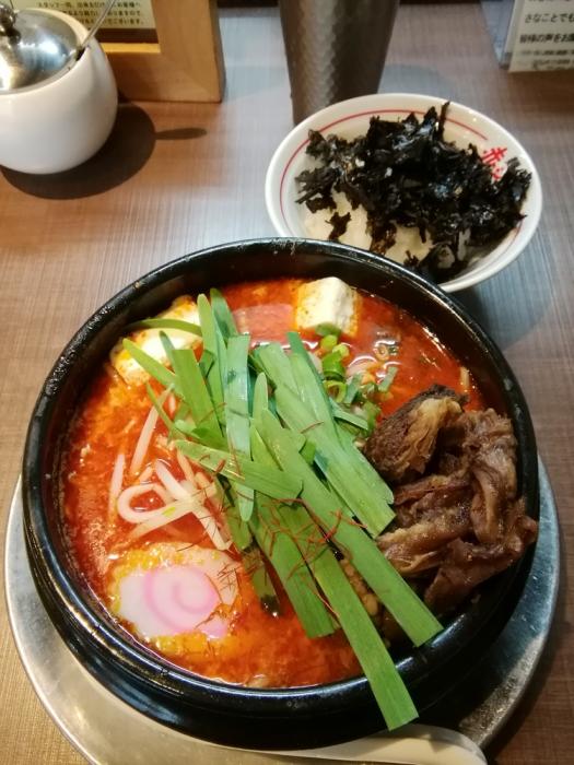 麺作赤シャモジ、土鍋牛スジらーめん(限定)980円(岩のりご飯付)。これは美味しくない、久しぶりの失敗作では?牛スジは噛みきれないほど硬いだけ、スープはピリ辛なだけで旨味は感じられませんでした。やっぱりラーメンの牛スジはある程度トロトロで、カルビスープのような旨味がないとご飯には合いませんでした。