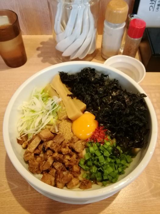 麺や真玄、油そば和え麺(太麺·豪華盛)780円。大盛1.5玉、特盛2玉、追い飯無料。10種の味変調味料は、粉チーズ、ニンニク、酢、フライドガーリック、カレー粉を入れました。真玄の油そばは、あっさりいただけます。〆に無料の追い飯で完了しました。