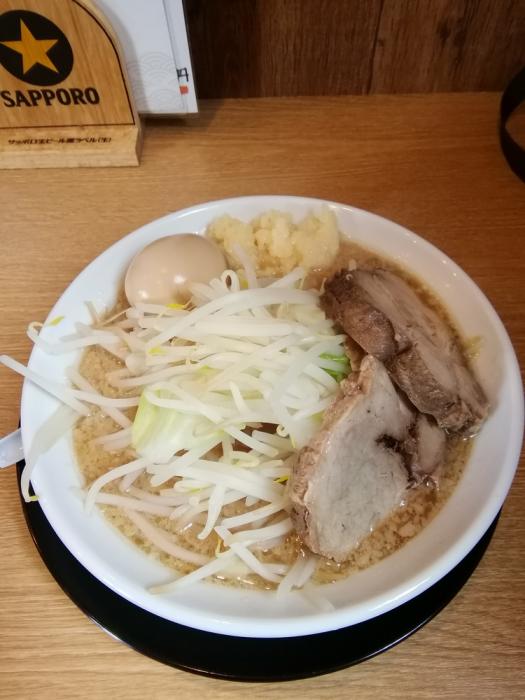 麺豪織蔵、織蔵ラーメン(味玉)900円。二郎系のラーメンで、野菜、脂、ニンニクの量が選べます。野菜、脂の量は普通、ニンニク増し増しを選びました。カラメ(スープの濃さ)は選べません、卓上のラーメンだれで調整します。分厚い柔らかチャーシューが美味です。