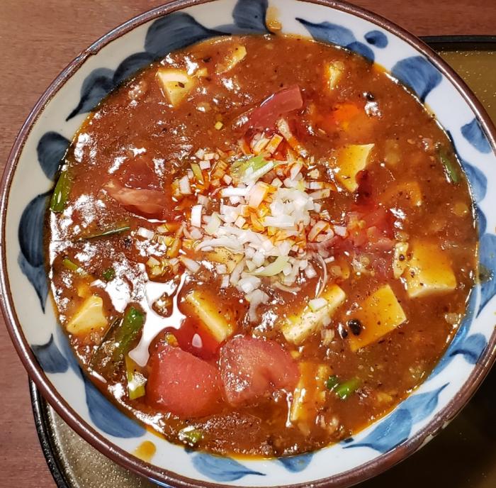 期間限定です。辛味はそのままにトマトの酸味が夏らしいです。お願いすると山椒瓶を渡してくれるので、痺れが好きなだけ味わえます。ご飯も無料です。