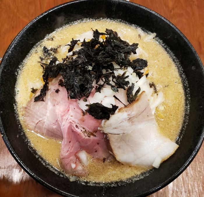 大きな2種類のチャーシューと岩のりの下には炒めたもやし・人参・ニラ・挽肉がもりもり隠れています。見た目よりボリューム満点。