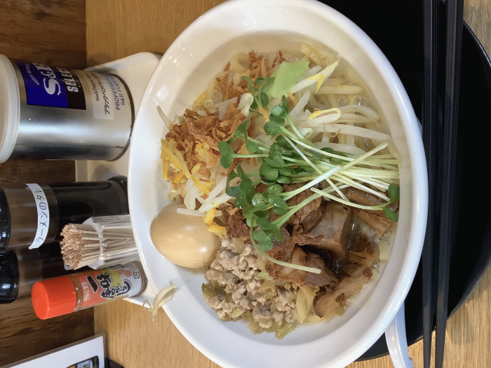 麺豪織蔵、【期間限定】吉乃川塩まぜそば1000円+味玉クーポン。1月末までの期間限定の清酒ラーメンです。アルコールはとんでいます。まぜそばですが、背脂塩味の珍しい汁ありタイプです。チャーシューは塩味が強いので、よく混ぜて麺やもやしと一緒にいただくことをおすすめします。