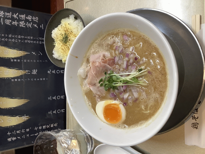 鶏そば縁道白根大通南店、【12/6〜12/7限定】濃厚魚介豚骨ラーメン900円+ダイブ飯120円。3周年の周年祭で12/6(水)〜12/7(木)の限定メニューで、濃厚魚介豚骨ラーメン900円と濃厚魚介豚骨つけ麺950円の2種類に、限定サイドメニューの肉飯350円、鶏タレかつ丼350円です。通常メニューもありました。