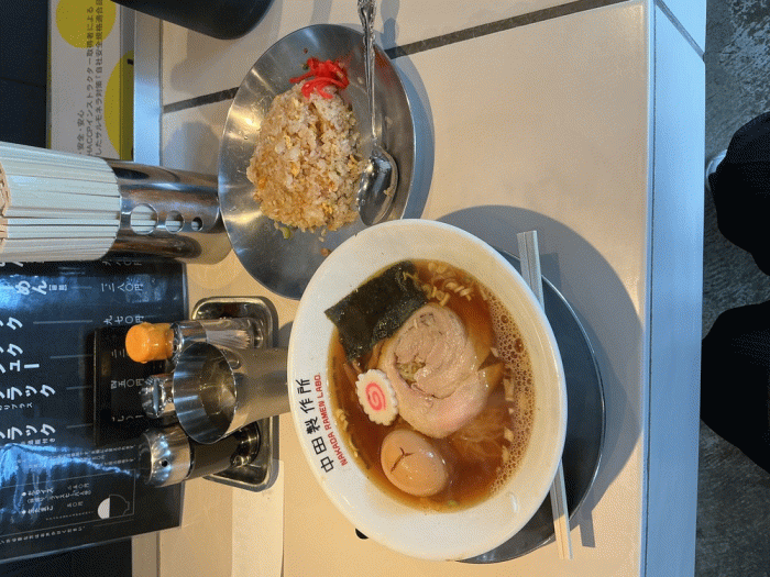 中田製作所、【1月水曜日限定】鶏煮干しそばチャーハンセット1100円+味玉110円。1月第1週目の水曜日限定は、鶏煮干しそば900円と鶏煮干しそばチャーハンセット1100円の2種です。チャーハンセットを選択。鶏煮干しそばは、チャーハンと合うようにしょっぱ目のスープとなっています。ラーメン単品で注文する場合は、ちょっとしょっぱく感じるかもしれません。