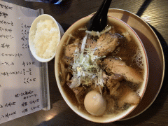 AKIHA 麺屋粋翔、肉ジンジャー(醤油)980円+小ライス付+味玉100円。どこを食べても肉の塊が入っています。角煮も入っています。スライスチャーシューに生姜醤油スープが合います。具材は、シンプルに白髪ねぎともやしチャーシューのみ。ご飯がついてくるのがわかります。