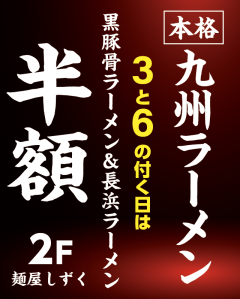 3と6の付く日は“本格★九州ラーメン”半額!!