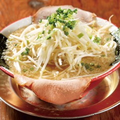 器のふちを隙間なく飾るチャーシューと味玉、メンマ、たっぷりもやしがボリューム満点のお得な一杯!! |