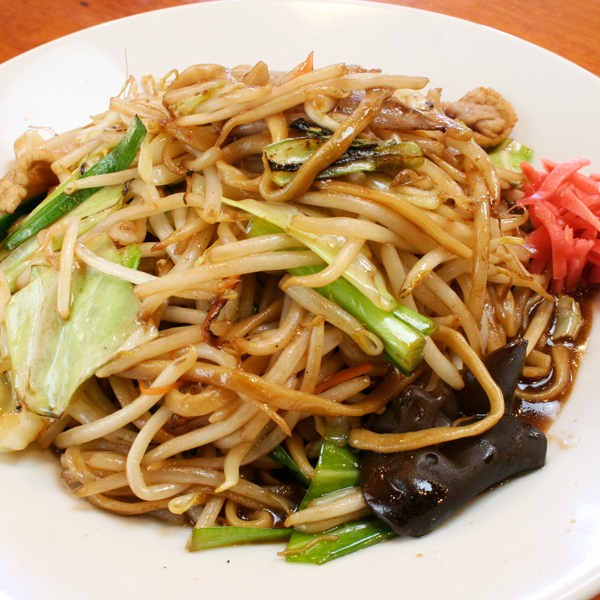 キャベツ、豚肉、人参、ニラ、きくらげ、モヤシなど野菜を中心とした具材がたっぷり!!焼きそばでは珍しい平打ち麺を使用しており食べごたえもバツグンです!!