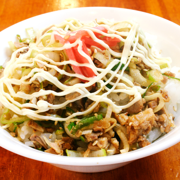 しっかり味の染み込んだチャーシューの角切りとさっぱりとしたネギをたっぷりかけた丼モノ!!お好みでマヨネーズもかければ更にジャンキー!!