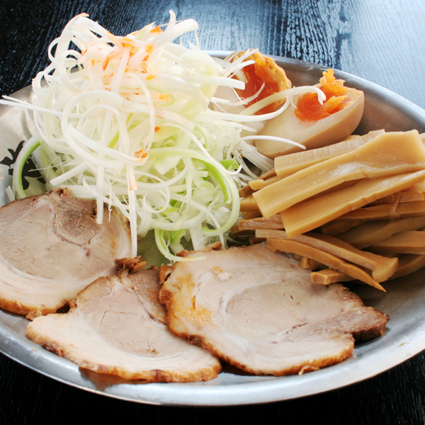 辣油をかけた白髪ネギ、味玉、おつまみメンマ、チャーシューのおつまみ盛り合わせ!!らーめん屋さんならではのお酒にピッタリなおつまみがセットになったお得な一品です。