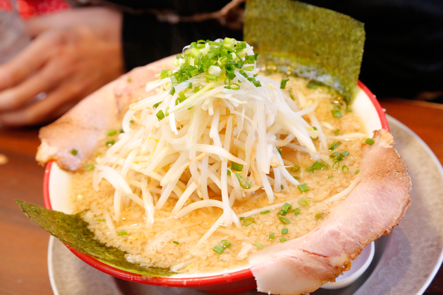 待つこと数分。綾ちゃんの前にだるまラーメンが到着。普通盛ではあるものの、背油&モヤシがたっぷり。意を決して、まずは背油浮かぶ、見るからに