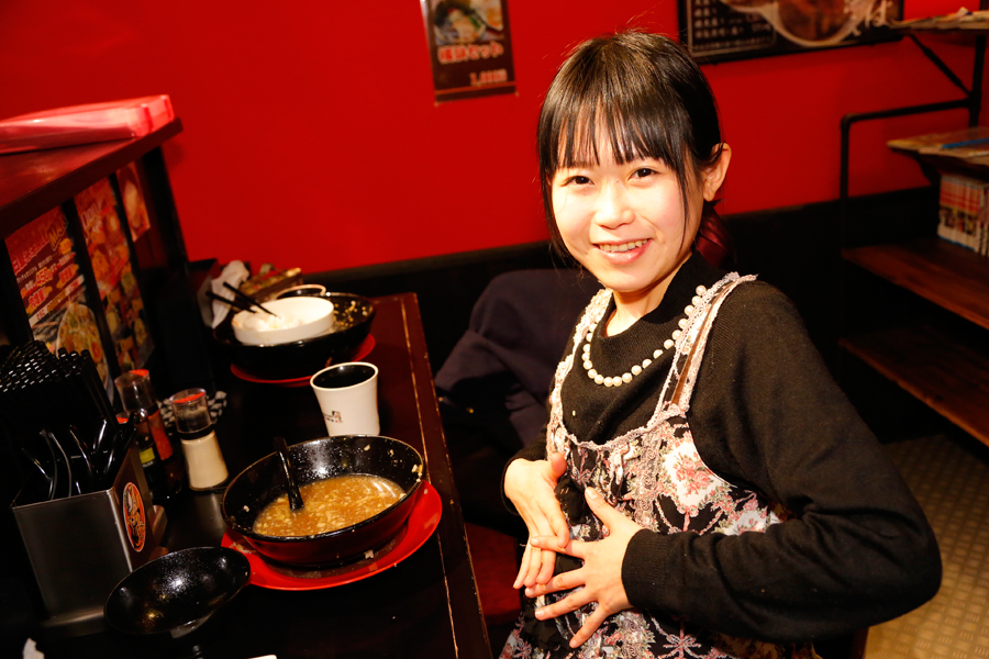 つお・カラメ・あぶらを「マシ」にした、綾ちゃん好みのちょっと濃いめの味付けで、大量の野菜もおいしそうに食べ進めます。一日レポのトリを飾る一杯を、ゆっくりと味わいながら胃に収め、そしてついに、最後のひとくちを飲み込む!おごせ綾、10杯目、完食!!!とうとうやり遂げました!!一日で10杯のラーメンを完食するという、驚異の記録を打ち立ててくれました!その笑顔は、とても輝いていました。綾ちゃん、本当に、お疲れ様でした!!
