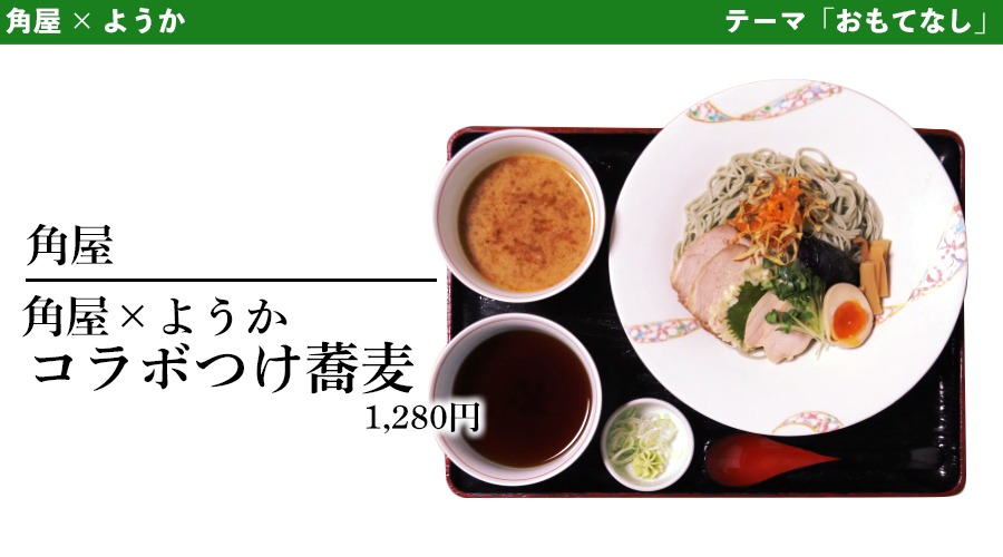 そばをイメージし、小麦の表皮ふすまを使用した食物繊維たっぷりの特別な麺と通常の自家製細麺2種を用意。さらにそば感、コラボ感を出すため、角屋のへぎ、お盆を使用。また、ようかでは煮干し油を味噌スープに浮かべました。「角屋」とスープの配合割合も変えてあるので、スープの違いを味わうのも楽しみの一つ。