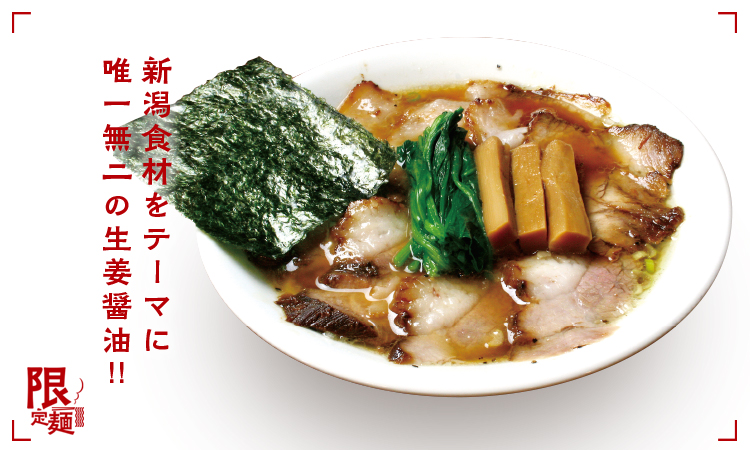 いっとうやスタイル!!初の生姜醤油が限定麺として登場。新潟ブランド純白のビアンカの腕肉を使用したチャーシューと強めにきかせた生姜の風味がガツンと印象的!!
