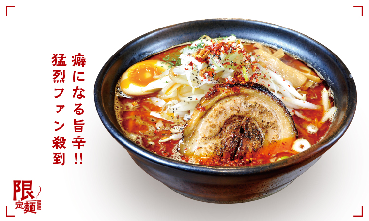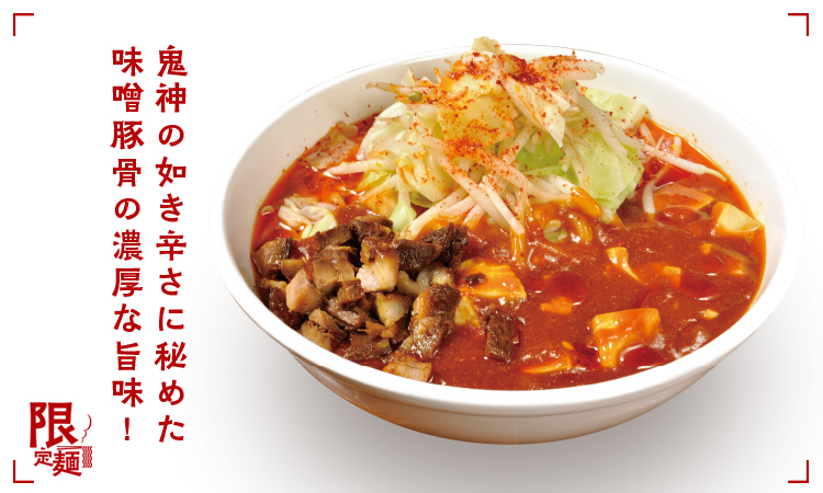 濃厚でまろやかな味噌豚骨スープに、激辛唐辛子「超鬼殺し」を使った特製激辛麻婆餡をたっぷり。自慢の極太麺に旨味と辛味が絡み付く、刺激的でクセになる一杯!