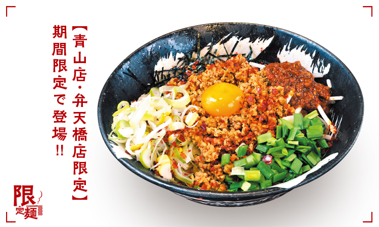 青山店&弁天橋店限定の「辛まぜそば」は20種類以上の香辛料をブレンドした辛味噌がアクセント!辛さ3段階、残ったスープに追い飯(無料)投入で二度美味しい!