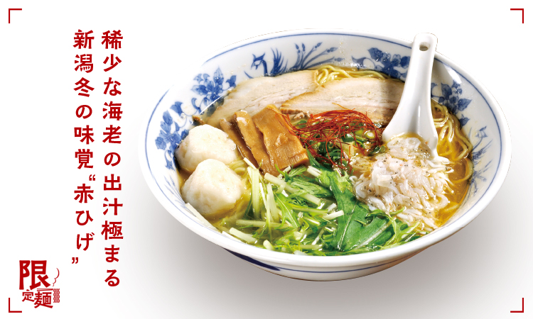 新潟でしか獲れない「赤ひげ」と呼ばれる希少な海老を、生の状態で贅沢にトッピング!重厚な海老出汁の上品な甘みと風味を全面に打ち出した、海老好き唸らす自信作!