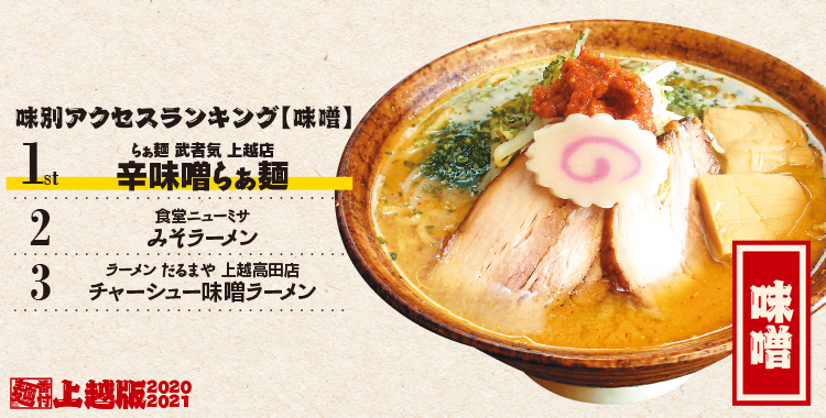 上越エリアの味別ランキング結果は「醤油」「味噌」「とんこつ」の3種に絞ってご紹介。これからドンドン伸びていくエリアなのでこれからが楽しみです。