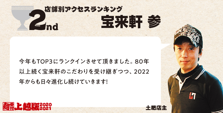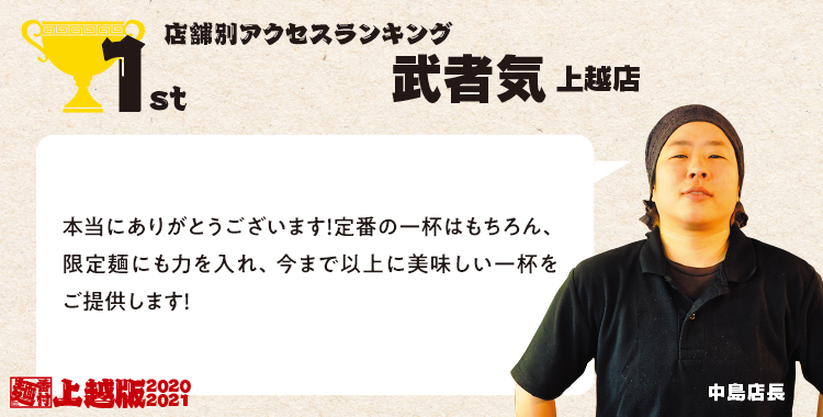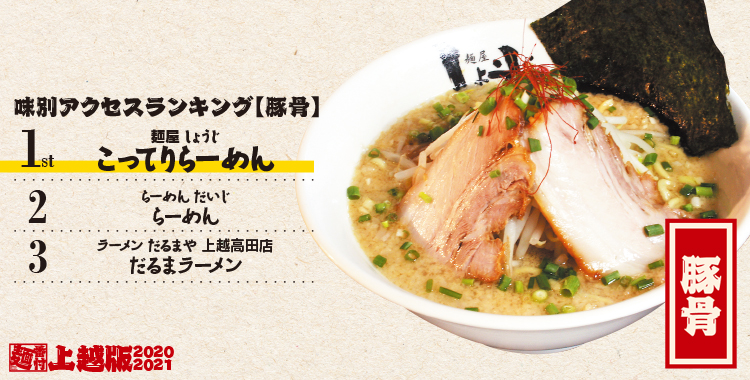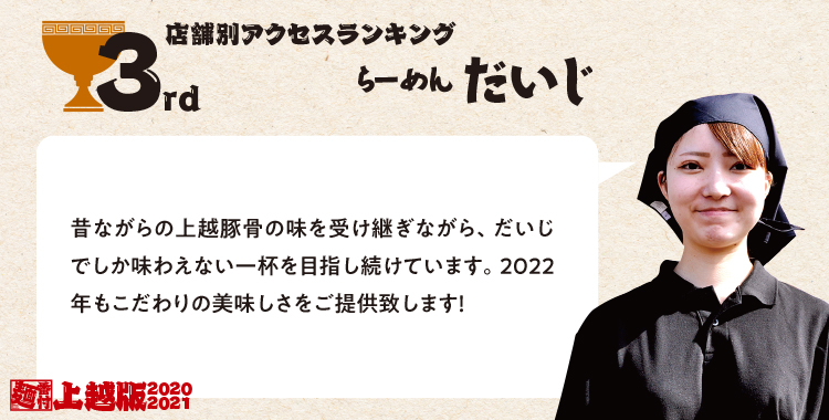 開設2年目の上越エリア、アクセスTOP3の結果は…栄えある1位は「武者気 上越店」となりました!2位には上越の有名店「宝来軒」、3位は上越豚骨で人気の「だいじ」がランクイン。徐々にランキングも賑わいをみせてきた上越エリア、来年も楽しみです!