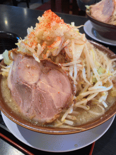 写真は野菜ダブルです。麺の上に大量のもやしが乗ります。ニンニクは普通量でも大さじ1杯くらいあるので、臭いにはご注意を。スープは案外あっさりしています。全然くどくない。極太麺は、めちゃくちゃ美味しいです